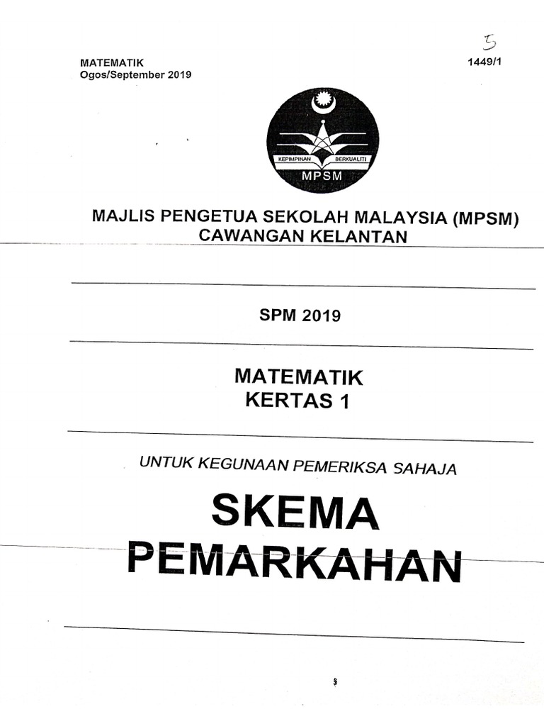 Koleksi Kertas Soalan Peperiksaan Sebenar Sijil Pelajaran Malaysia SPM dan Skema Jawapan. Koleksi Soalan Peperiksaan Sijil Pelajaran Malaysia SPM 2020 2021 2022 ini adalah alat latihan untuk mempersiapkan diri untuk Peperiksaan SPM untuk mendapatkan gred yang baik. 155774196 Skema Jawapan Matematik Lipis Calon dikehendaki memuat turun contoh-contoh soalan percubaan SPM melalui link di bawah dalam.